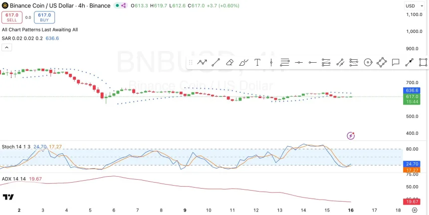 The $BNB 4-hour price 4hr chart reveals a recent period of consolidation after a sharp downward movement. The most significant technical pattern at the moment is the potential for a breakout. The Parabolic SAR (Stop and Reverse) indicators are positioned below the price, signaling an ongoing bullish trend. However, the market is currently experiencing fluctuation, meaning that there is a possibility of consolidation before a clearer breakout occurs.