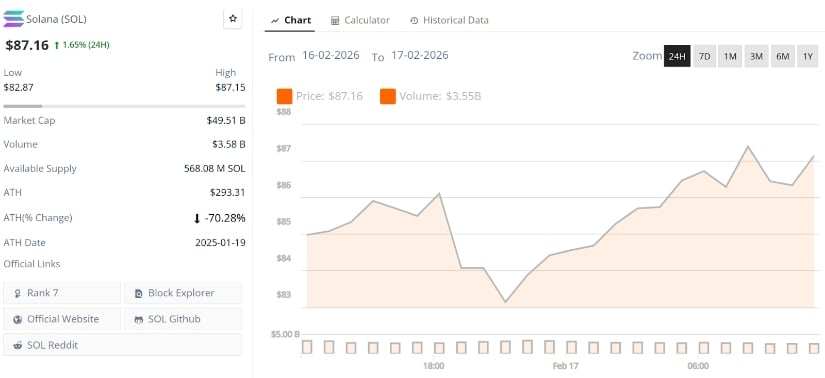 WikiBit 2026-02-18 07:02Solana price is drawing renewed market attention as price action holds near key support levels while