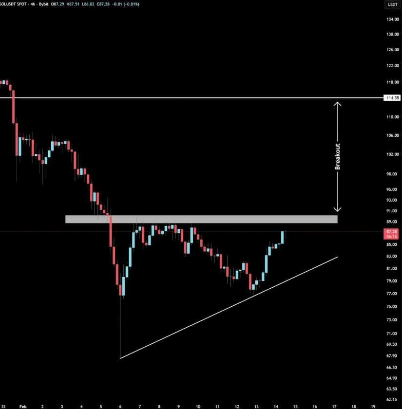 Technical projections shared by market analyst Elja suggest that Solana may be forming a recovery structure with a potential breakout setup developing above current levels. The primary resistance zone sits near the $110–$115 region, which remains a key barrier to confirm bullish continuation.