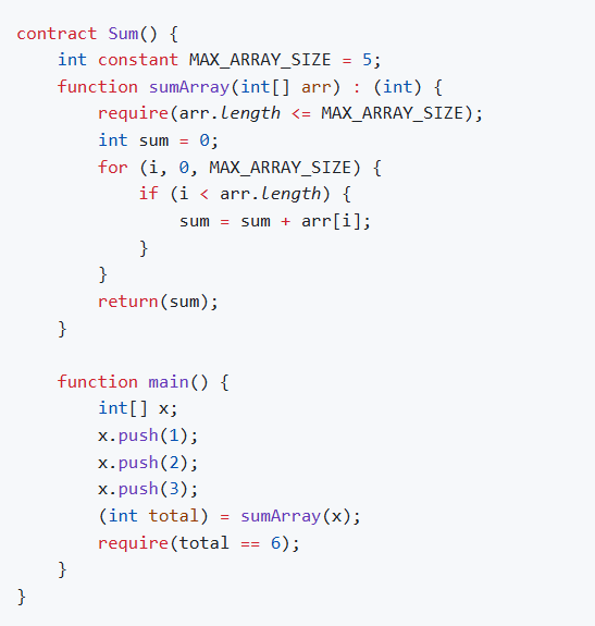 Silverscript uses a simplified C-like syntax. The following example demonstrates arrays, loops, and require statements: