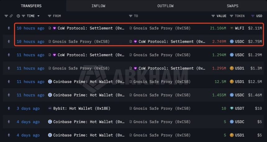 Another key factor supporting the $WLFI price surge is aggressive whale accumulation. On-chain data shows that a newly created wallet spent approximately $2.75 million USDC to purchase over 21 million $WLFI tokens in a single transaction.