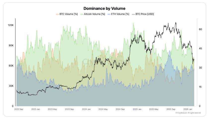 During deep corrections or the late stages of bear markets, investors typically rotate their capital toward the flagship digital asset while abandoning altcoins.