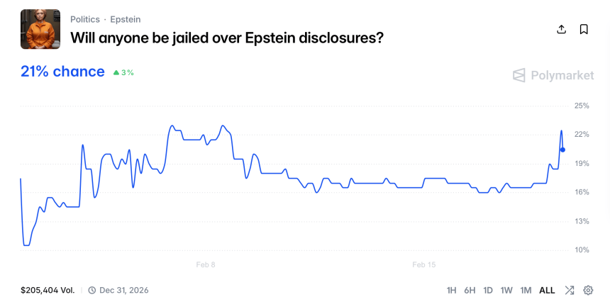That uncertainty has fueled a fresh round of wagers across leading prediction platforms, including Polymarket and Kalshi. One Polymarket contract currently assigns a 21% probability that someone will be jailed in connection with the Epstein disclosures.