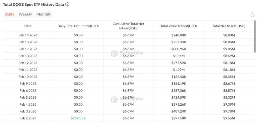 As of Feb. 19, the cumulative net inflows across the U.S. $DOGE spot ETFs were $6.67 million, with a 18-day streak of $0 in net inflows and total net assets of approximately $8.8 million.