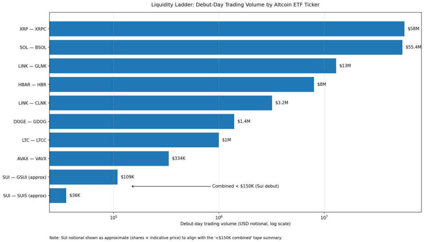 While Solana's BSOL debuted with $55.4 million in day-one trading volume in October 2025 and $XRP's XRPC opened with roughly $58 million a month later, Sui's twin launches struggled to generate liquidity equivalent to a single large institutional block trade.