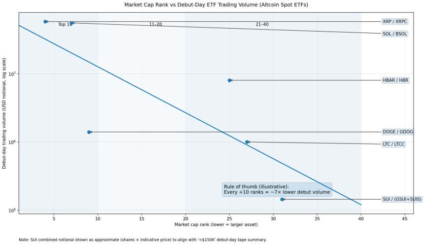 A rough quantitative read suggests that every 10 rank drops corresponds to a roughly 7-fold decline in opening-day trading volume. By rank 30, implied debut-day volume falls into the low six figures, exactly where Sui landed.