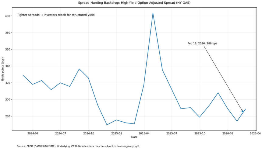 Credit markets are in spread-hunting mode. High-yield option-adjusted spreads hovered around 286 basis points on Feb. 18, according to FRED data.