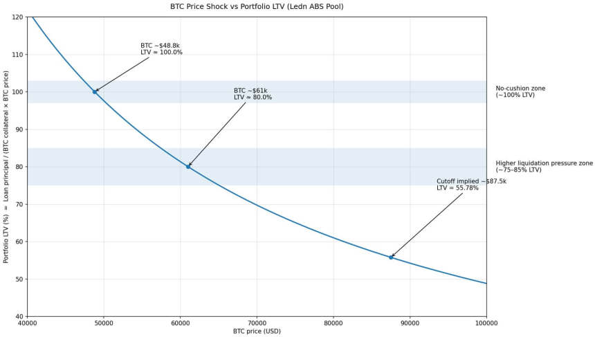 If Bitcoin falls to $61,000, the portfolio LTV will automatically reach roughly 80%. If Bitcoin falls to $48,800, the portfolio LTV reaches 100%, and collateral equals the loan principal.