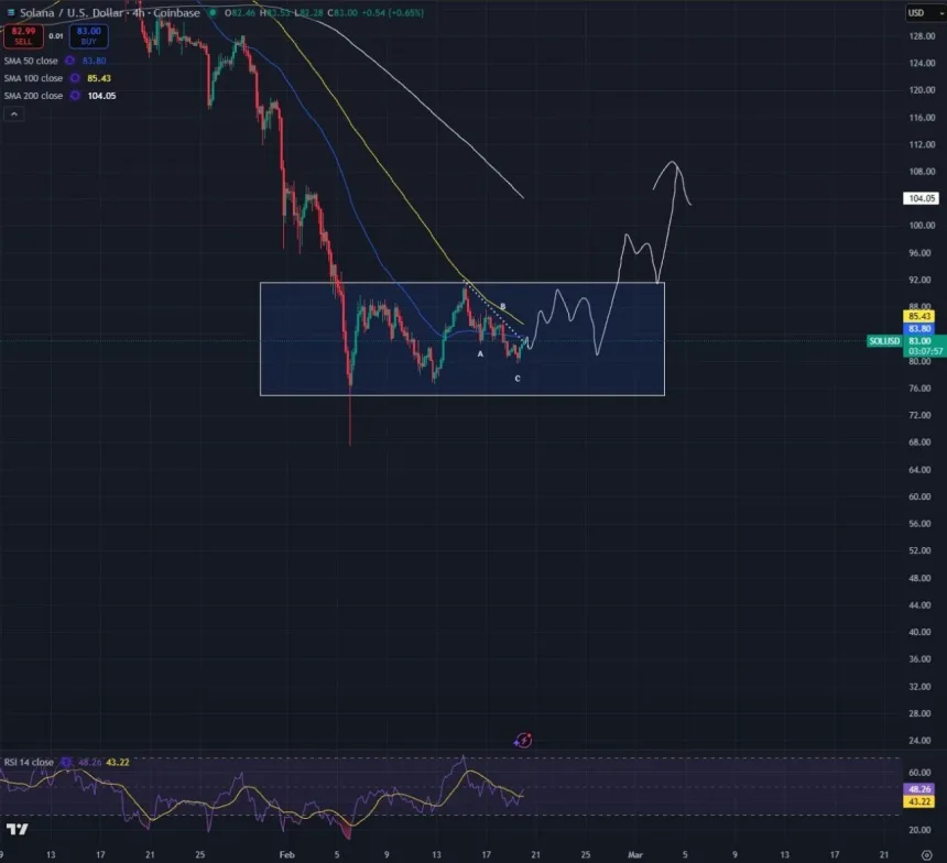 However, price action began to compress into a defined range between roughly $78 and $92. Within this box, $SOL printed a sequence of lower lows followed by a modest rebound and then another dip, which the analyst marked as an A-B-C structure. As a result, price stopped trending in a straight line lower and instead moved sideways. This shift suggested a pause in downside momentum rather than a confirmed reversal.