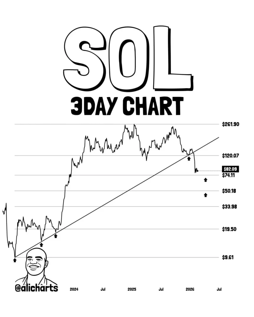 Solana broke below a rising trendline that guided price action through much of the prior cycle, based on a 3-day chart shared by market analyst Ali Charts. The trendline connected multiple higher lows from 2023 into 2025. Once price lost that structure, the broader market structure shifted from trend support to downside continuation. As a result, the chart now shows a clear loss of long-term momentum.