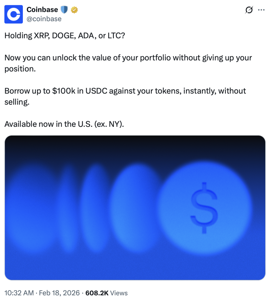 Coinbase recently expanded its collateralized loan product to support additional digital assets, allowing eligible US users to borrow up to $100,000 in $USDC ($USDC) against tokens including $XRP ($XRP), Dogecoin (DOGE), Cardano (ADA) and Litecoin (LTC) without selling.