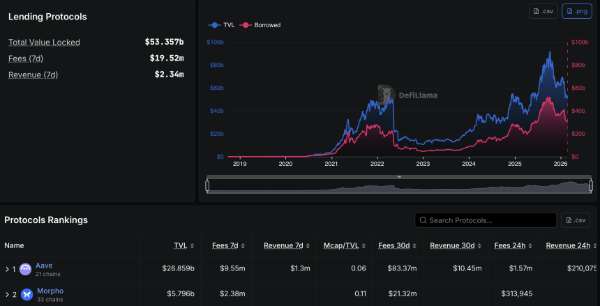 Aave accounts for nearly half of that total with just under $26.9 billion in TVL, followed by Morpho protocol at around $5.8 billion.