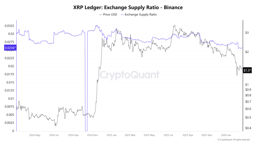 However, Binance has continued to see consistent $XRP outflows on its platform amid the downturn. Specifically, the collapse of the $XRP exchange supply ratio on Binance to 0.025 marks a 17% drop from the 0.0302 reading from October 2025, when the current market onslaught picked up momentum.