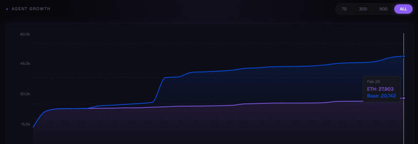 Data from agentsevm shows Ethereum currently leads in deployed AI agents by network, with 27,903. Coinbase-backed Base is next at 20,623.