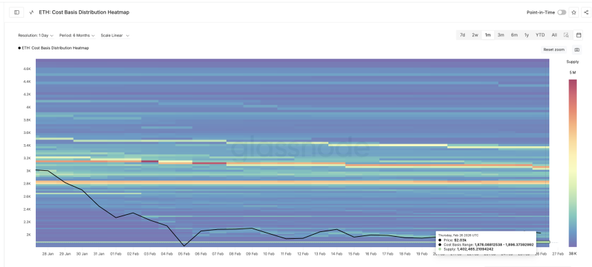 The Ethereum cost basis heatmap reveals a major support cluster between $1,870 and $1,890. Around 1.40 million $ETH was accumulated in this range. This level is important because it represents the average buying zone for a large group of holders.