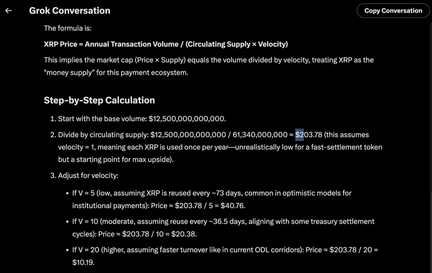 However, it acknowledged that this suggestion is unrealistic for a fast-settlement token. In a more realistic scenario, according to Grok, if $XRP changes hands at a moderate rate, its price could range from $10 to $25.