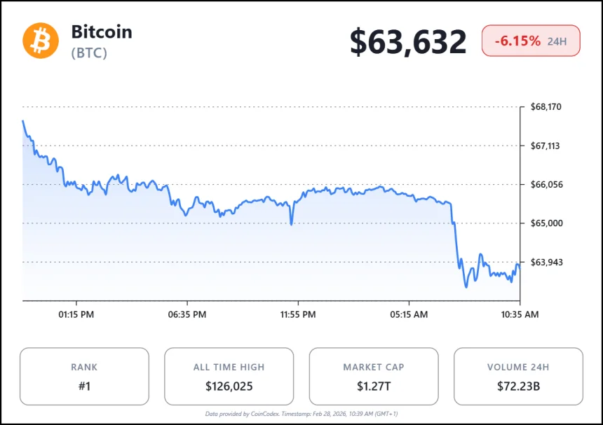 WikiBit 2026-02-28 15:02Bitcoin plunged to as low as 63,068 USD overnight before finding support around 63,500 USD, marking