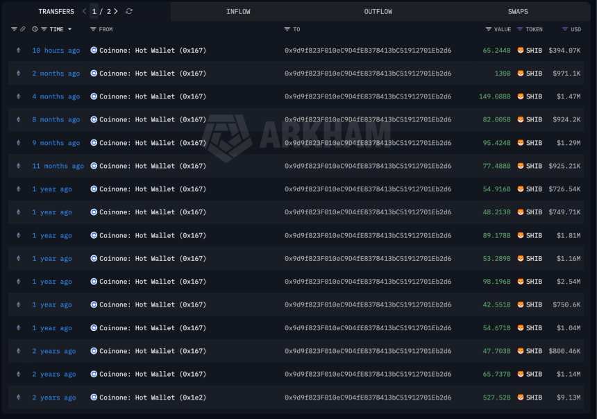 Interesting events unfolded today with the Shiba Inu token, just as the market heads into the weekend, and crypto never sleeps. According to Arkham, wallet “0x9d9f823” withdrew from CoinOne, a major South Korean cryptocurrency exchange and one of the oldest in the country, 65.244 billion $SHIB, equivalent to just over $394,000.
