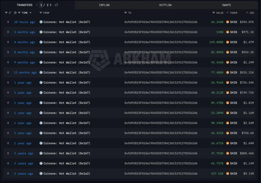 A crypto wallet with an unusual transaction history made headlines on Friday after withdrawing 65.244 billion Shiba Inu tokens from CoinOne, one of South Korea's oldest cryptocurrency exchanges. The withdrawal, valued at approximately $394,000, ranked among the largest $SHIB exchange outflows of the day, according to blockchain intelligence platform Arkham.