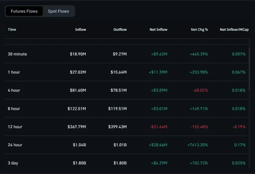 The 24-hour futures data carries more weight. Total inflows came in at $1.04 billion against $1.01 billion in outflows. The result is a net inflow of $28.66 million. The net change percentage surged 7,413.20%, signaling a sharp shift in positioning bias over that window.