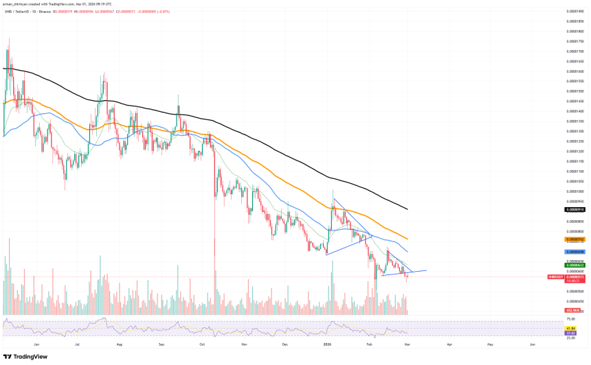 Every major moving average is still below $SHIB on the daily chart. Strengthening the overall bearish pattern that has prevailed since late 2025, the 50-day and 100-day lines are still well above price action.
