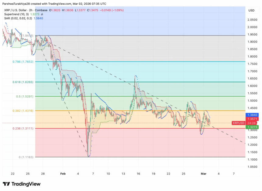 WikiBit 2026-03-02 21:02$XRP price today trades near $1.3475, down 1.09% after testing the Supertrend support at $1.3273. Th