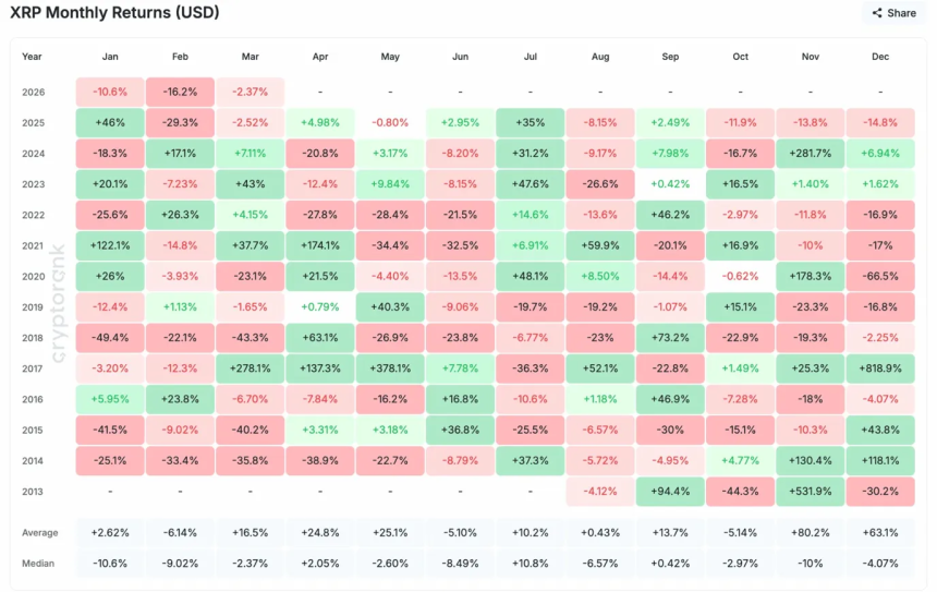 2026 year-to-date performance shows January down 10.6%, February down 16.2%, and March currently tracking -2.37%. This marks three consecutive months of losses, placing 2026 among the weaker years in $XRPs history.