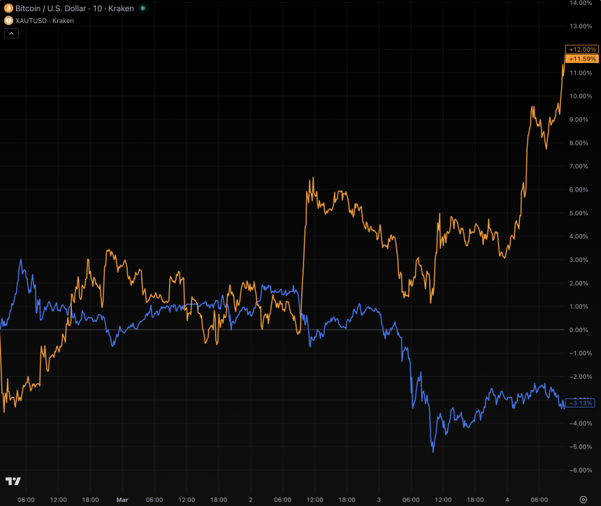 Price comparison of $BTC (orange) and gold (blue) since 1:15am New York time on Saturday.