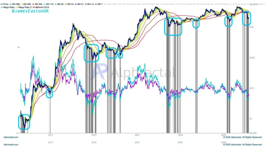 A long term Ethereum chart shared by analyst James Easton on X highlights a surge in the “Smart DCA” indicator, which historically appeared during periods of market accumulation. The chart overlays Ethereum price with several moving averages, including MA7, MA14, MA21, MA50, MA90, MA116, MA200, MA365, and MA720.