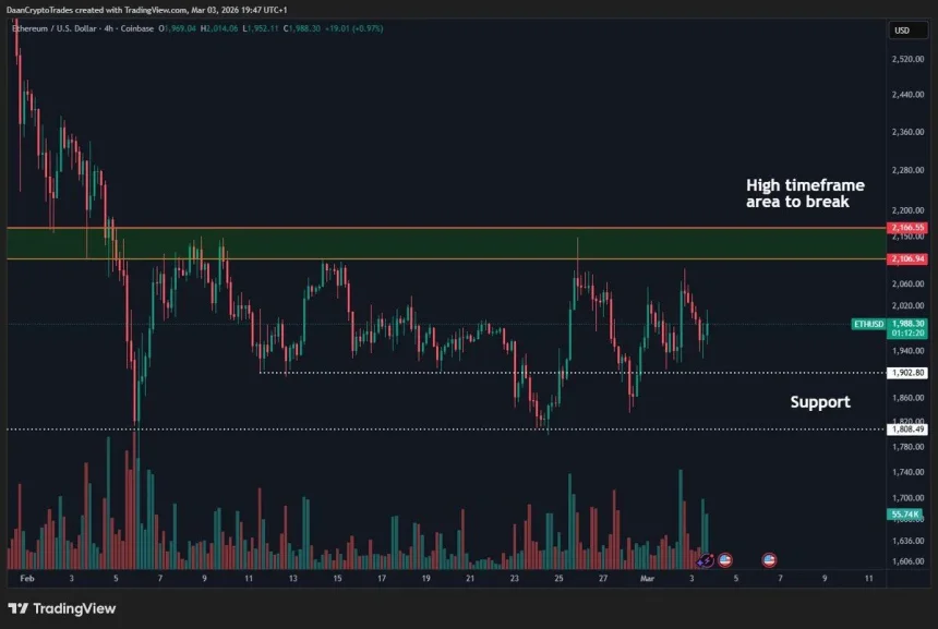 Meanwhile, a four hour Ethereum chart shared by analyst Daan Crypto Trades on X shows price attempting to move gradually higher while maintaining a sequence of marginally higher lows. The chart outlines a consolidation structure where $ETH fluctuates between a defined support area and a resistance zone above.