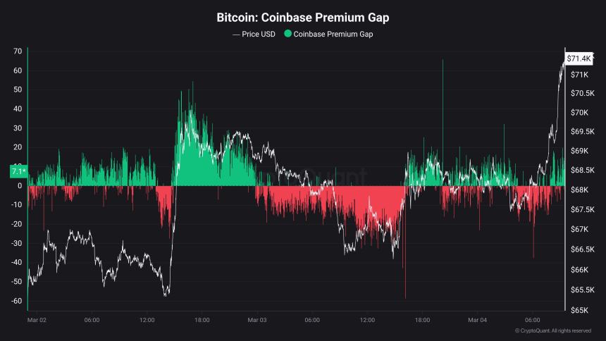 Interestingly, alongside the confident rhetoric from the Coinbase leadership, both the CEO and head of strategy at CryptoQuant's charts show that the American exchange is currently the place where large U.S. players are buying $BTC at $70,000 per coin and higher. This creates what is known as the Coinbase Premium gap, where the price of $BTC on Coinbase becomes higher than on other global platforms.