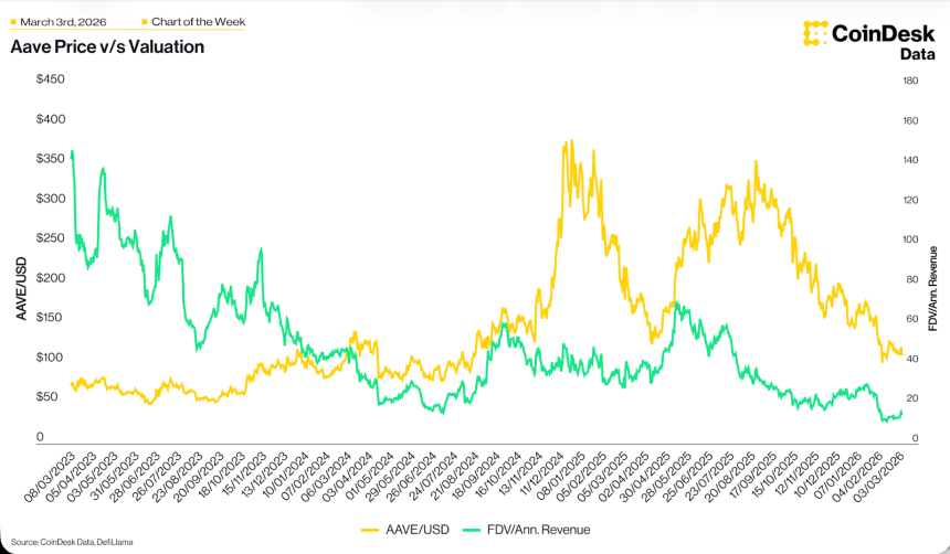 Aave is currently experiencing a fundamental valuation reset: while the token price remains higher than its 2024 lows, the FDV/annual revenue ratio has collapsed back to those levels (<20x), indicating the protocol is generating significantly more revenue relative to its market cap than it did during the speculative peaks of 2025. This decoupling suggests the market is heavily discounting Aaves current earnings power, likely pricing in the execution risk following the narrow March 1 passage of the “Aave Will Win” proposal and the high-profile exit of core developer BGD Labs.