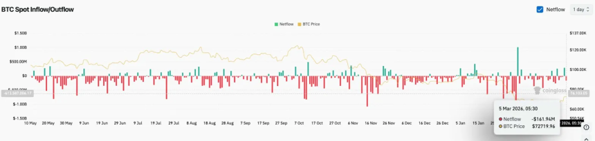 On March 5, spot exchange flows showed a net outflow of $161.94 million, which means that holders are still moving tokens off exchanges. The difference between rising open interest and spot outflows suggests that derivatives traders are getting ready to buy while spot holders sell into strength.