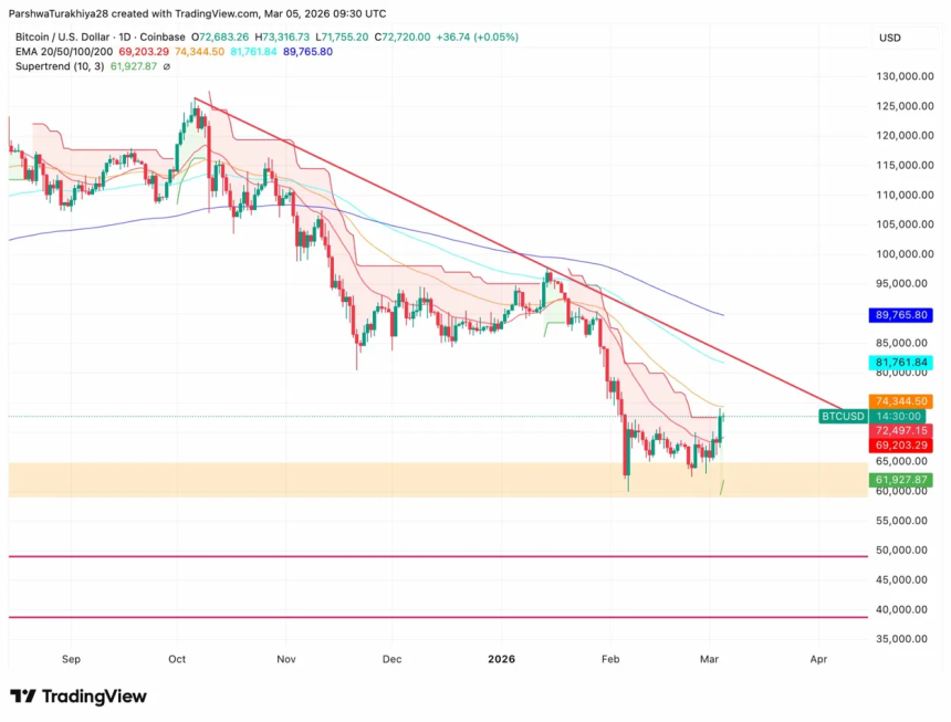 WikiBit 2026-03-05 20:00Bitcoin price today trades near $72,720, up 0.05% after reclaiming the $72,000 level following a bou