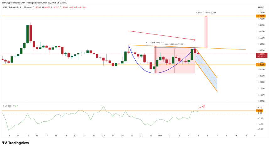 The right side of the cup formed after $XRP rebounded nearly 16% from its February 28 low, and the asset is now consolidating inside the handle. If buyers push the price above the neckline, the breakout could trigger a measured move toward $1.72 (the $1.70 zone), a 17% projection from the neckline.
