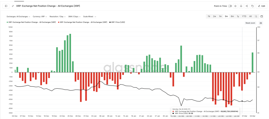 However, the rally arrives as underlying support weakens. Exchange flows are turning toward selling pressure, derivatives traders are increasing leverage, and activity on the $XRP Ledger has cooled sharply since February. Together, these factors suggest the bullish setup could face pressure if demand fails to recover.