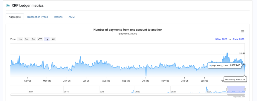 At the same time, broader $XRP Ledger activity has slowed. The number of payment transactions on $XRP Ledger peaked at around 2.18 million in early February but has since dropped to roughly 1.03 million, representing a decline of about 53%.