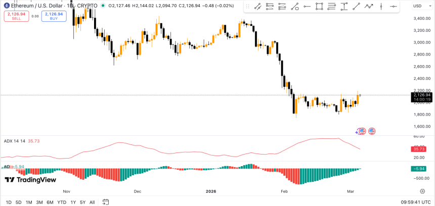 Ethereum (ETH) trades around $2,126, showing modest upward movement as the market rebounds from an earlier dip near the $2,040 region. The intraday chart displays a quick recovery followed by a push toward the $2,190 area, where momentum slows and the price begins moving sideways.