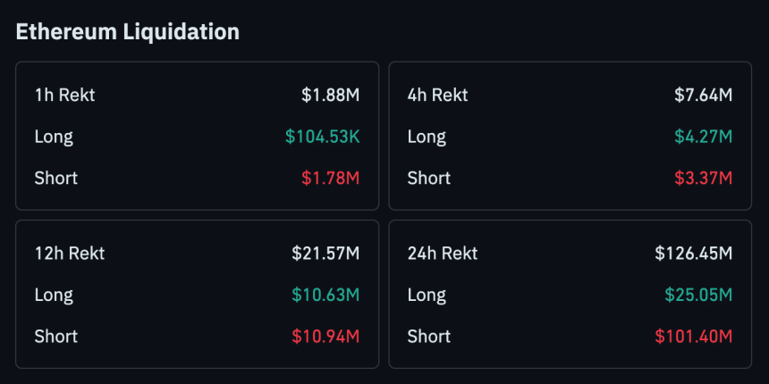 Over the past 24 hours, total liquidations reach about $126.45 million, with short positions accounting for roughly $101.40 million, while long liquidations stand near $25.05 million. The imbalance suggests that a large number of traders betting against Ethereum are forced to close positions.