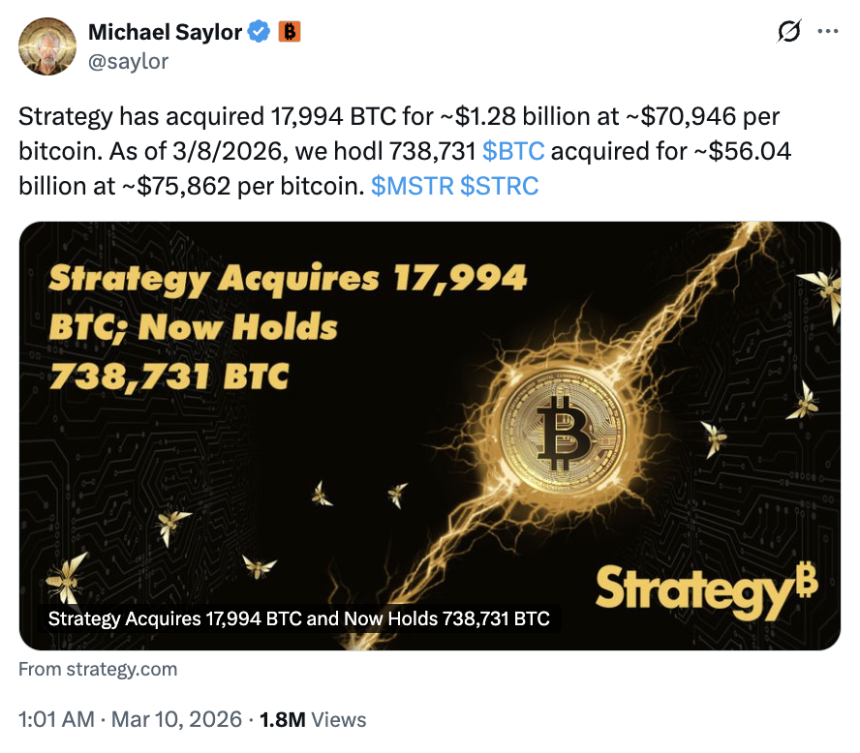 WikiBit 2026-03-10 12:02The purchase, confirmed in a Securities and Exchange Commission filing, brings Strategys total holdi