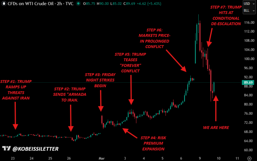 Oil prices drop as Trump hints at de-escalation of conflict. Source: The Kobeissi Letter