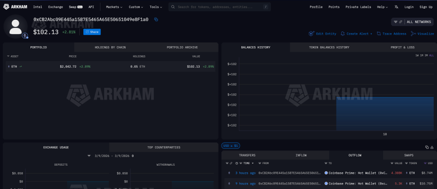 Bitmine Immersion Technologies moved approximately 9,600 $ETH to Coinbase Prime hot wallets on Tuesday in two separate transfers, Arkham data shows.