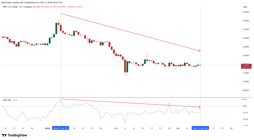 On the $XRP/USD Coinbase chart, CMF peaked on January 7. Since then, both the price and CMF have steadily declined. By March 11, CMF has dropped to around –0.10, firmly below the zero line. This aligns with the weak ETF flows tracked earlier. As retail-like investors form 84% of the ETF market, the CMF weakness can be primarily attributed to them.