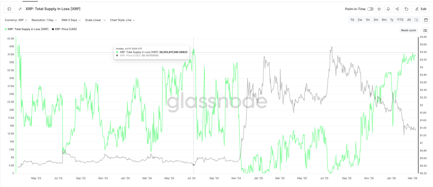 The current reading represents the highest level since July 7, 2024, when supply in loss briefly reached about 39.05 billion $XRP.