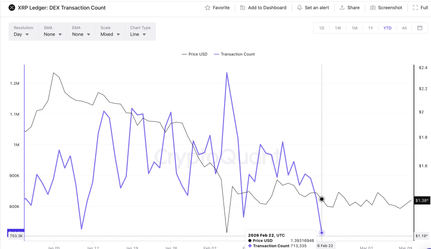 Year-to-date DEX transaction count has fallen to roughly 713,335 transactions, the lowest level recorded so far in 2026.
