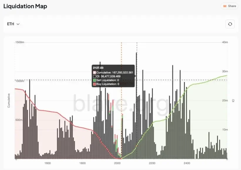 Meanwhile, a liquidation map shared by Blave highlights a large cluster of short liquidations near the $2,130 level on Ethereum. The chart shows where leveraged positions could be forced to close if price moves into that zone.