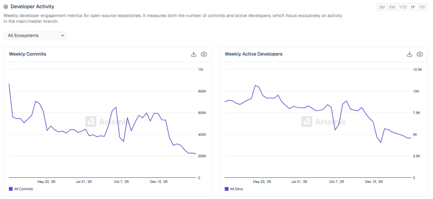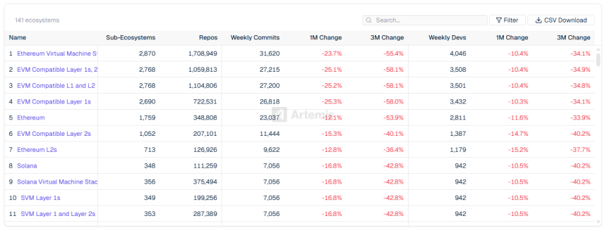 Data from Artemis shows that developer activity in the crypto sector has declined significantly over the past year.