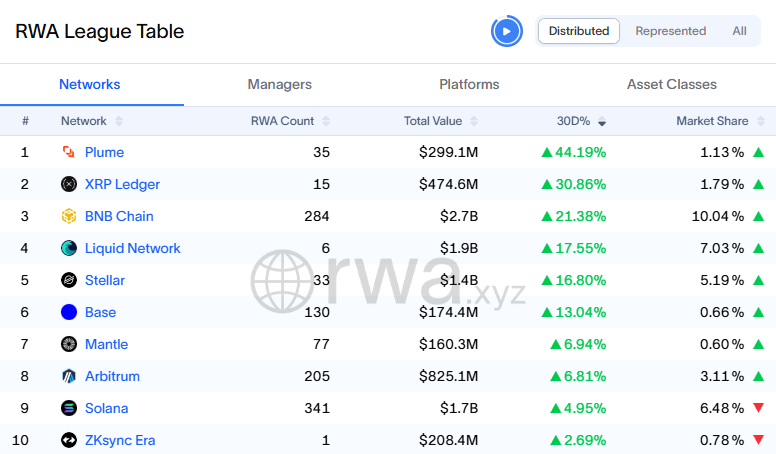 According to data from rwa.xyz, Plume ranks first in RWA value growth over the past 30 days, recording a +44.19% increase. This performance surpasses other networks such as the $XRP Ledger (+30.86%), $BNB Chain (+21.38%), and Stellar (+16.80%).
