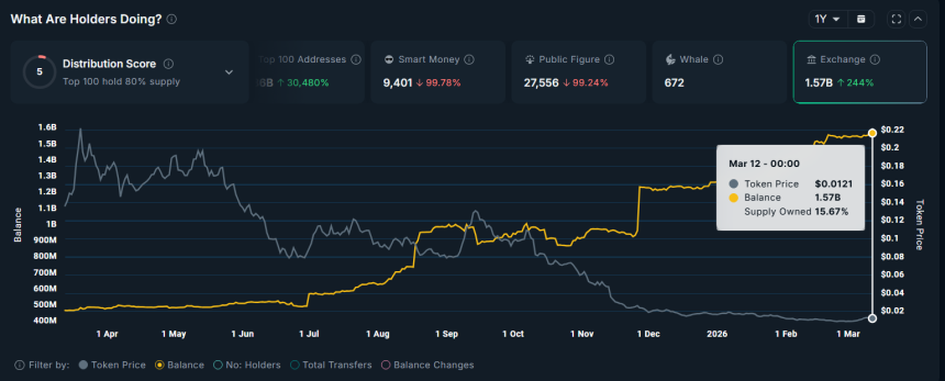 Data from Nansen shows that the amount of $PLUME held on exchanges has steadily increased over the past year. The balance reached a new high in March, surpassing 1.57 billion tokens and accounting for 15.67% of the total supply.