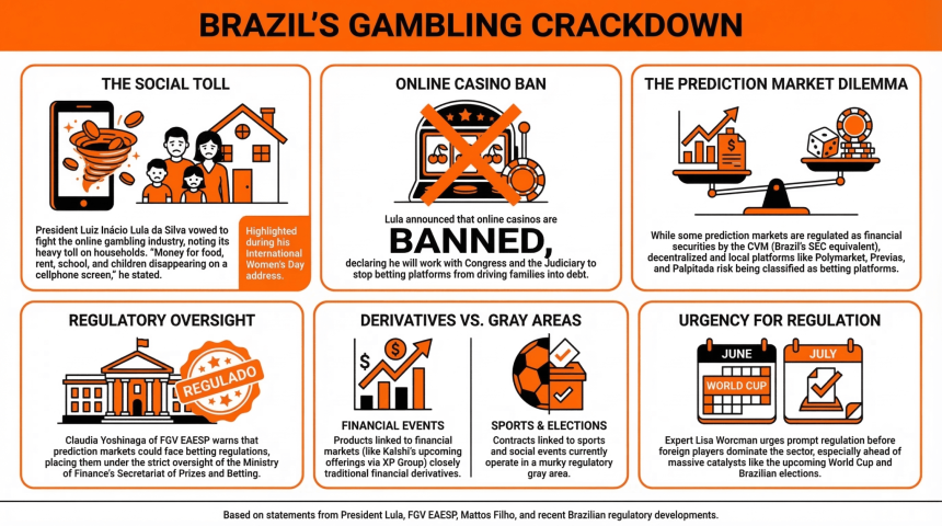 After President Lula proposed a ban on online betting platforms in Brazil, as the country faces a gambling epidemic, unregulated prediction markets may be hurt. Analysts agree that these platforms operate in a “gray area” as there is no specific law overseeing them.